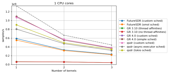 Mis divisible byN, this strategy allocates the Dummy Source and the firstM/NSaxpy blocks in the chain to the first CPU core, the nextM/NSaxpy blocks in the chain to the next CPU core, and so on until reaching theN-th CPU core, to which the lastM/NSaxpy blocks as well as the Benchmark Sink are allocated. IfMis not divisible byN, then firstM % NCPU cores get allocatedfloor(M/N) + 1Saxpy blocks, and the remaining CPU cores get allocatedfloor(M/N)Saxpy blocks. In FutureSDR achieved by using a custom CPU pin scheduler that uses a flow scheduler with a local queue for each worker thread that contains the blocks allocated to that thread, in flowgraph order. In GNU Radio 3.10 this is achieved by using CPU affinities to pin each block to its correspoinding CPU. In GNU Radio 4.0 this is achieved by a custom multi-threaded scheduler that forms job lists containing the blocks allocated each thread, in flowgraph order.